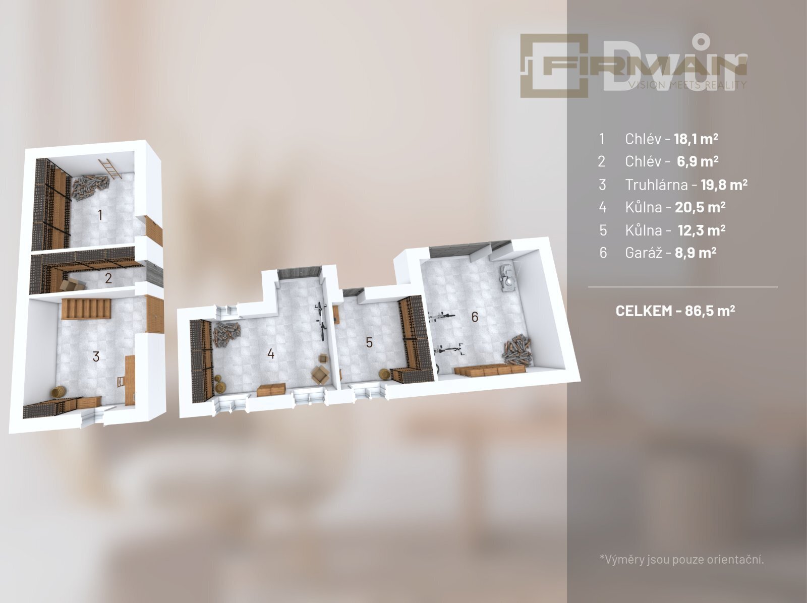 Dům má zastavěnou plochu 199 m² a celková předpokládaná plocha všech prostor – včetně půdy, chlévů, garáží, dílen, sklepů a dalších technických místností – činí přibližně 400 m². Obytná část domu nabízí v současnosti dispozici 4+1 s obytnou plochou cca 90 m². Dva pokoje, kuchyně a koupelna s toaletou jsou ihned obyvatelné, což umožňuje pohodlné bydlení už od prvního dne a postupnou rekonstrukci dle vlastního tempa a možností.