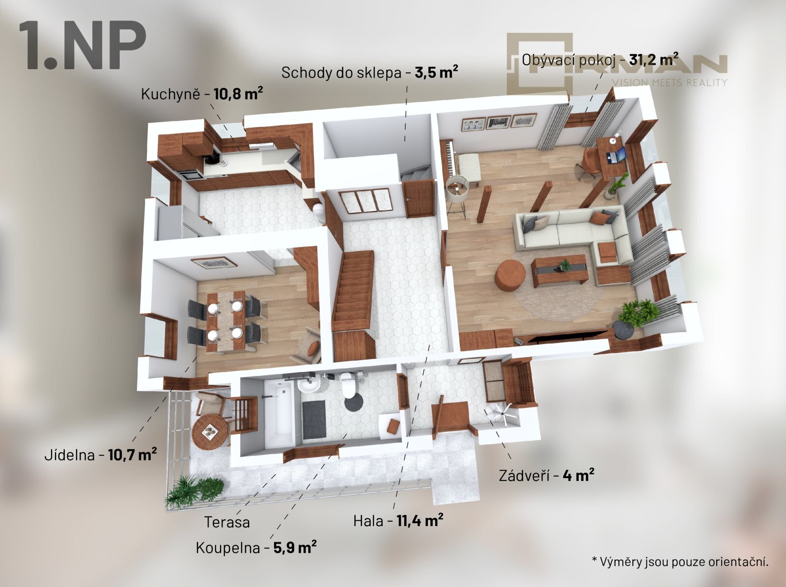 Dům je dispozičně řešen jako 5 +1 a díky své vnitřní uspořádanosti může bez problémů fungovat jako dvougenerační bydlení. Uvedená výměra je orientační a je do ní započítán sklep, dílna a druhý sklep.